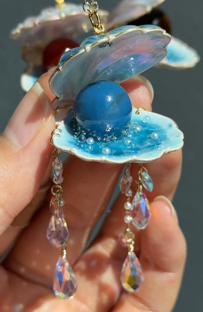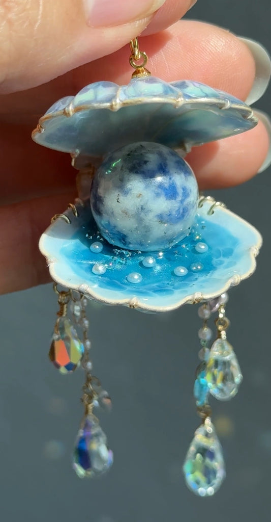 Handmade suncatchers featuring unique seashells, each carefully crafted by me and paired with a crystal sphere in a matching color theme. Every piece is thoughtfully designed to create a harmonious, one-of-a-kind look. Each shell has its own crystal with beautiful hand painted water effects with small faux pearls and accent details.